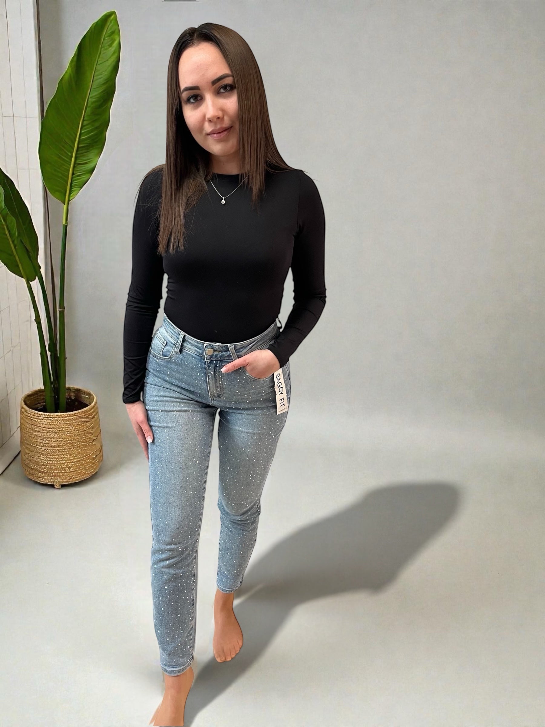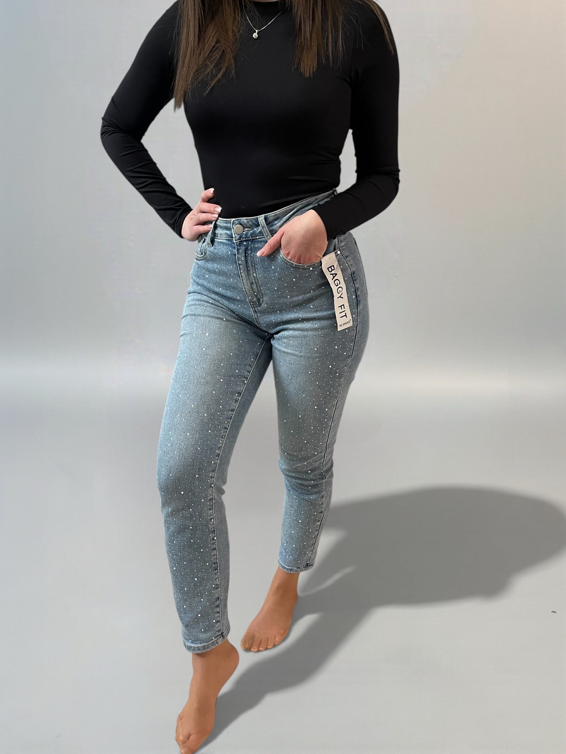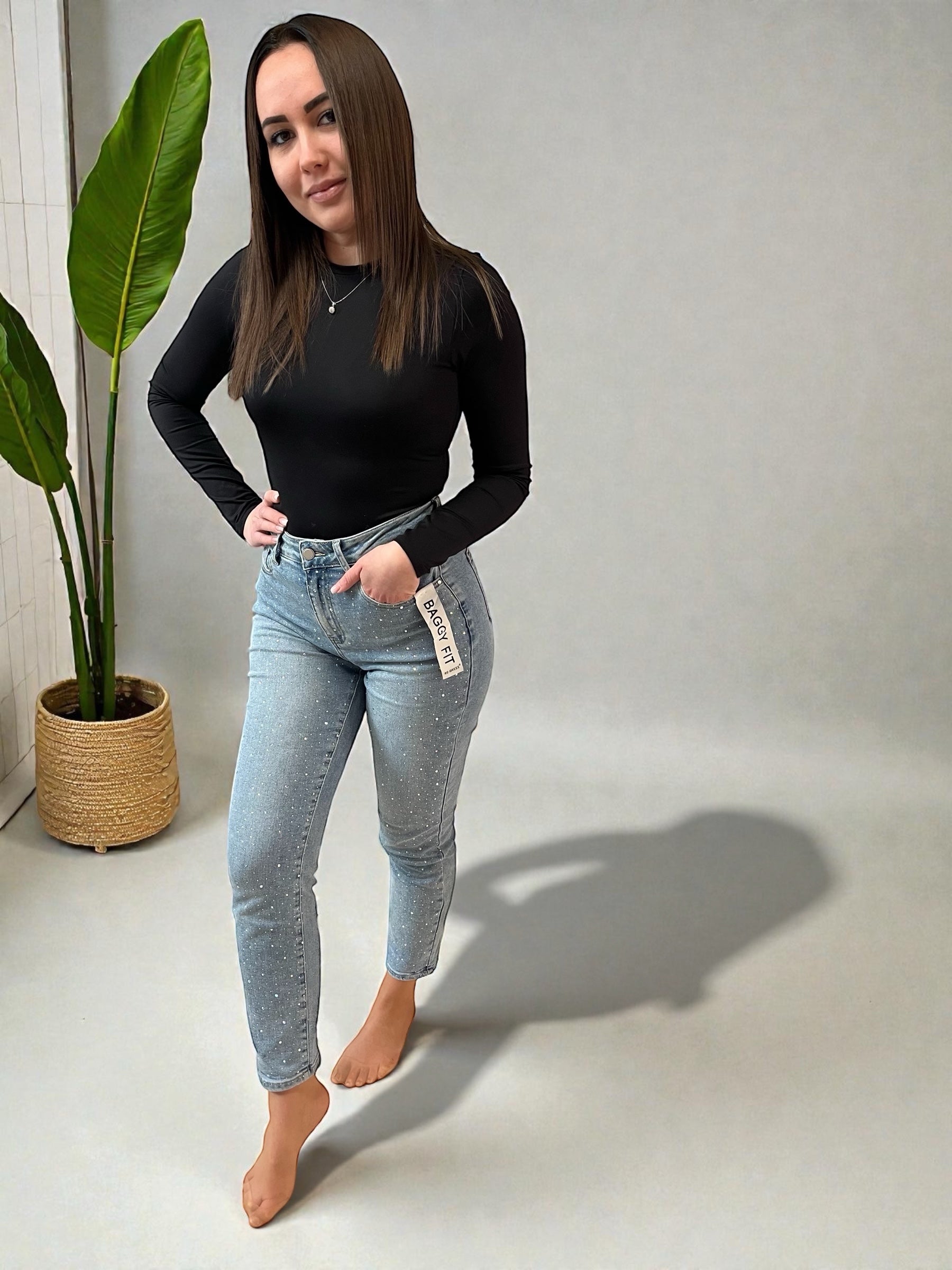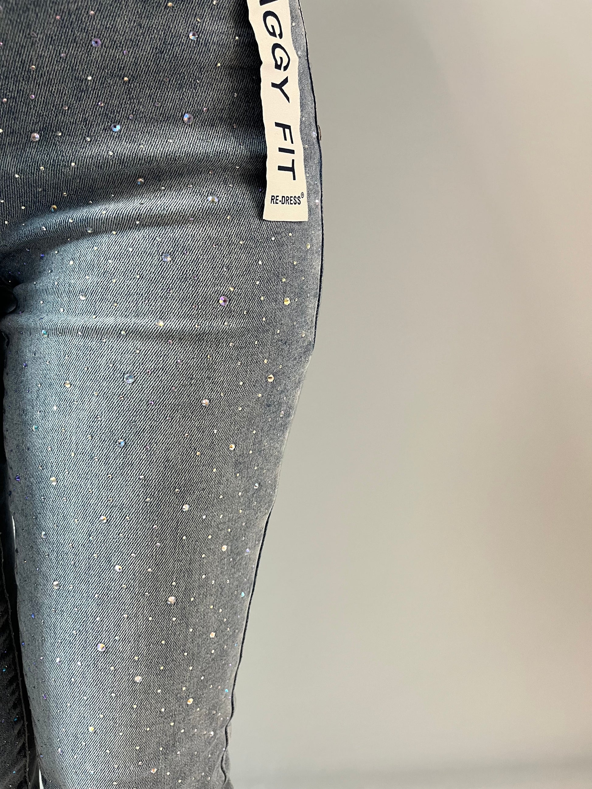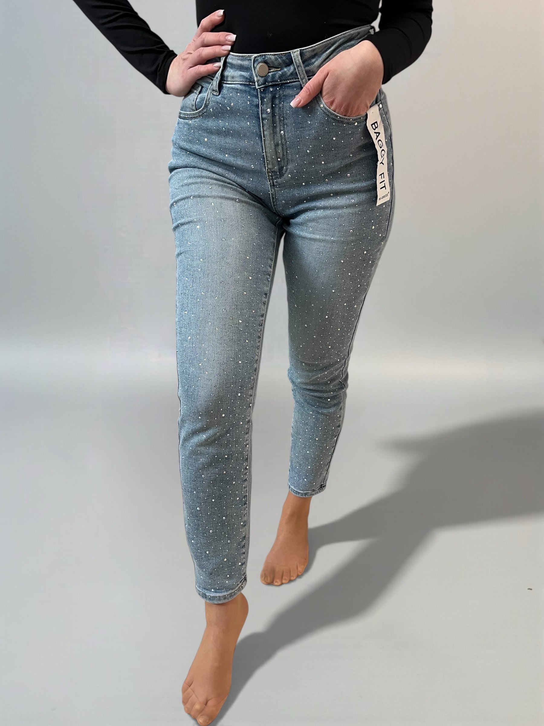 A kényelmes baggy fit szabás maximális mozgásszabadságot biztosít, míg a nadrágot borító apró strasszkövek minden lépésnél megcsillannak, garantálva a feltűnő megjelenést.